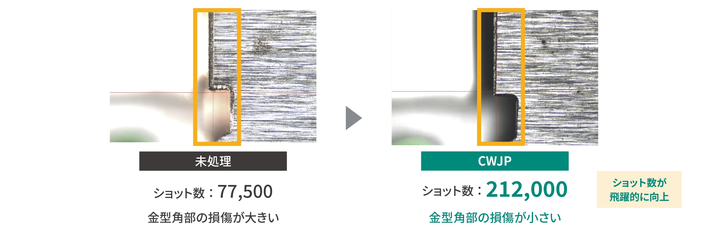 代表的な金型部品では、処理前後で成形回数(ショット数)が明確に向上しており、CWJPの効果がわかります。