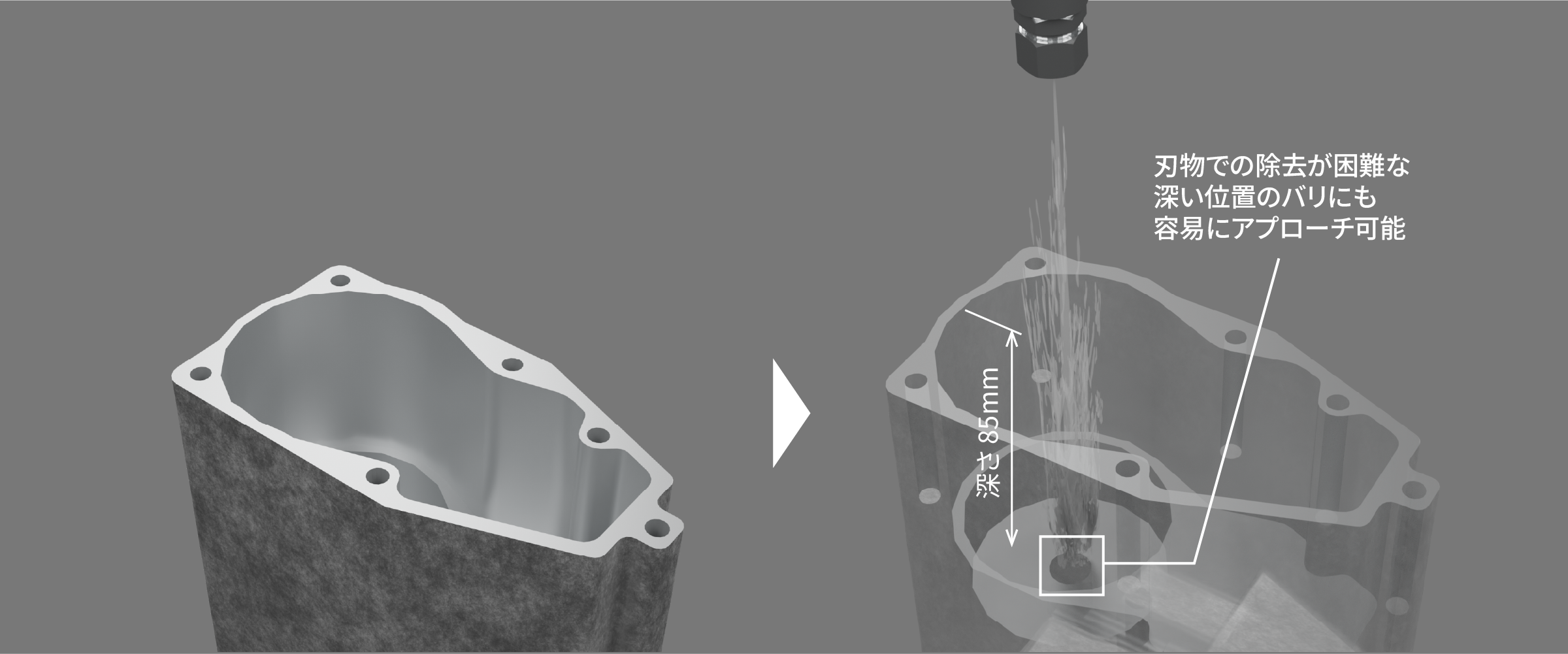 奥まった部分に発生したバリをバリ取り工具で除去する場合、突出し長さを長くする必要があります。しかし、突出し長さが長い状態で高速回転すると振れやビビりが発生しやすいため、非常に危険であり、仕上がりも安定しません。ウォータージェットバリ取りは衝撃力が減衰しにくいという特性があるため、工具では届かない奥まったところのバリであっても安全に安定して除去することが可能です。