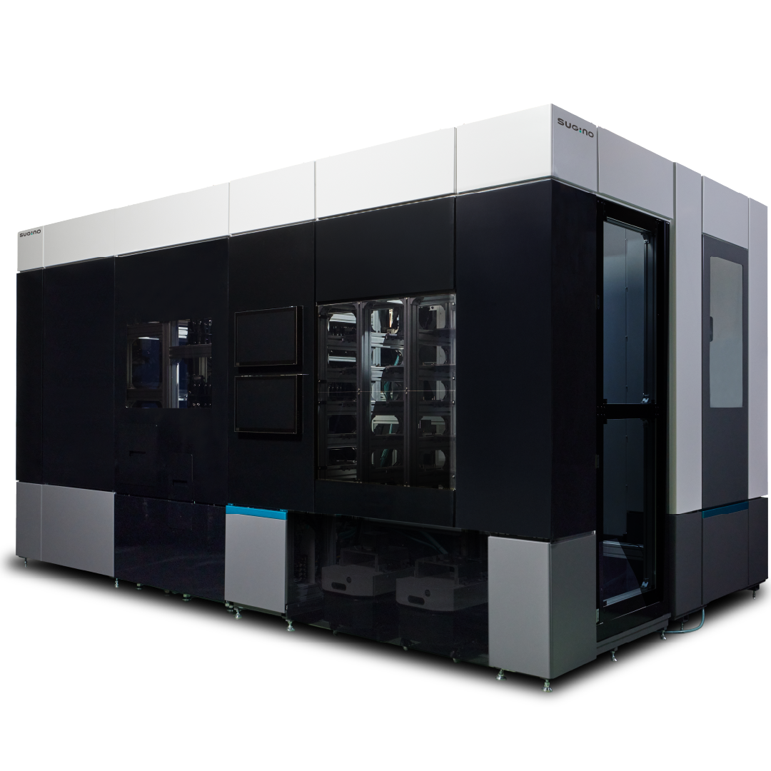 Our machining center’s ultra-fast cutting technology, combined with a 100-tool magazine for extended unmanned operation, in-machine measurement and thermal displacement correction, and a work stocker & automated transfer system, enables automation of small-lot, multi-variety production.