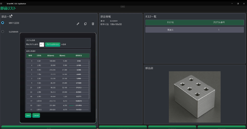 | X10 process management software | Part number management, program management, tool management Machining schedule management |