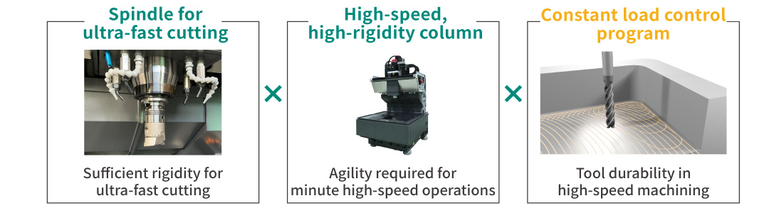 Utilizes the load control machining function of 3D-CAM to achieve high-speed, high-efficiency cutting beyond conventional methods. Original recipes (tool information and tool path settings) condensed with Sugino Machine’s unique know-how are pre-set, allowing easy program creation without specialized knowledge. Anyone can reproduce high-efficiency machining without relying on experience or skills.