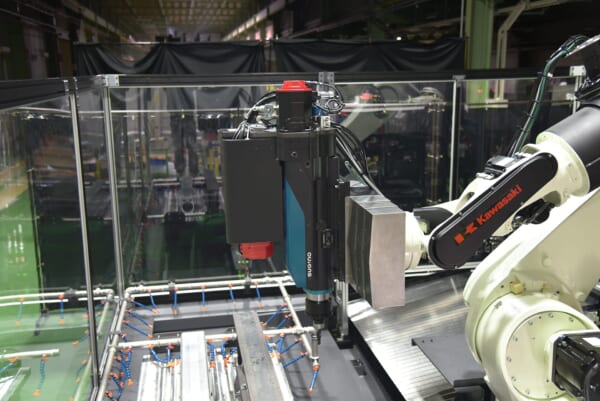 「ロボットマシニングシステム」は、当社製のロボットマシニングユニット「SELFEEDER DUO Robot Edition」を産業用ロボットの先端に取り付けて、ロボットによる切削加工を行う装置です。これまでユニット単体で販売してきましたが、量産加工に必要となる周辺機器や付帯設備の設計・組み立てもスギノマシンで行い、1つの切削加工機(システム)として販売を開始します。