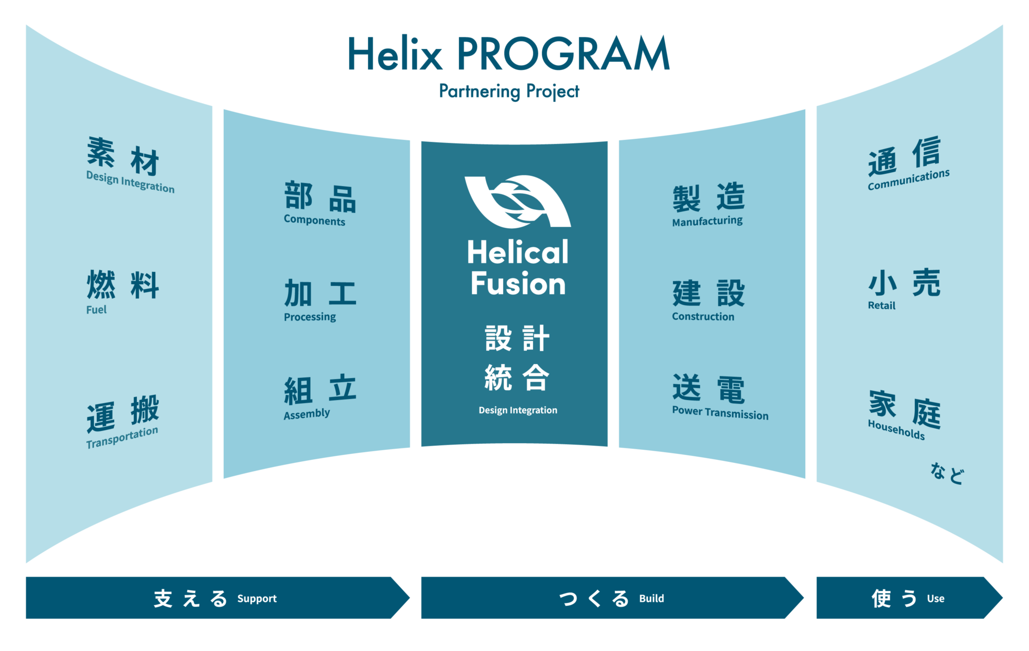 Helical Fusionは、「フュージョンエネルギー産業」全体を日本から創造することを目指しています。その実現のため、ものづくりから小売業まで、エネルギーを支え・つくり・使う、全ての営みに関わる産業パートナーの力を合わせ、日本発でフュージョンエネルギー産業を築き上げていきます。そのために、Helical Fusionの計画に賛同する日本全国・全分野のパートナーとの連携を拡大し、一刻も早い実現を目指すのが「Helix Programパートナリングプロジェクト」です。
