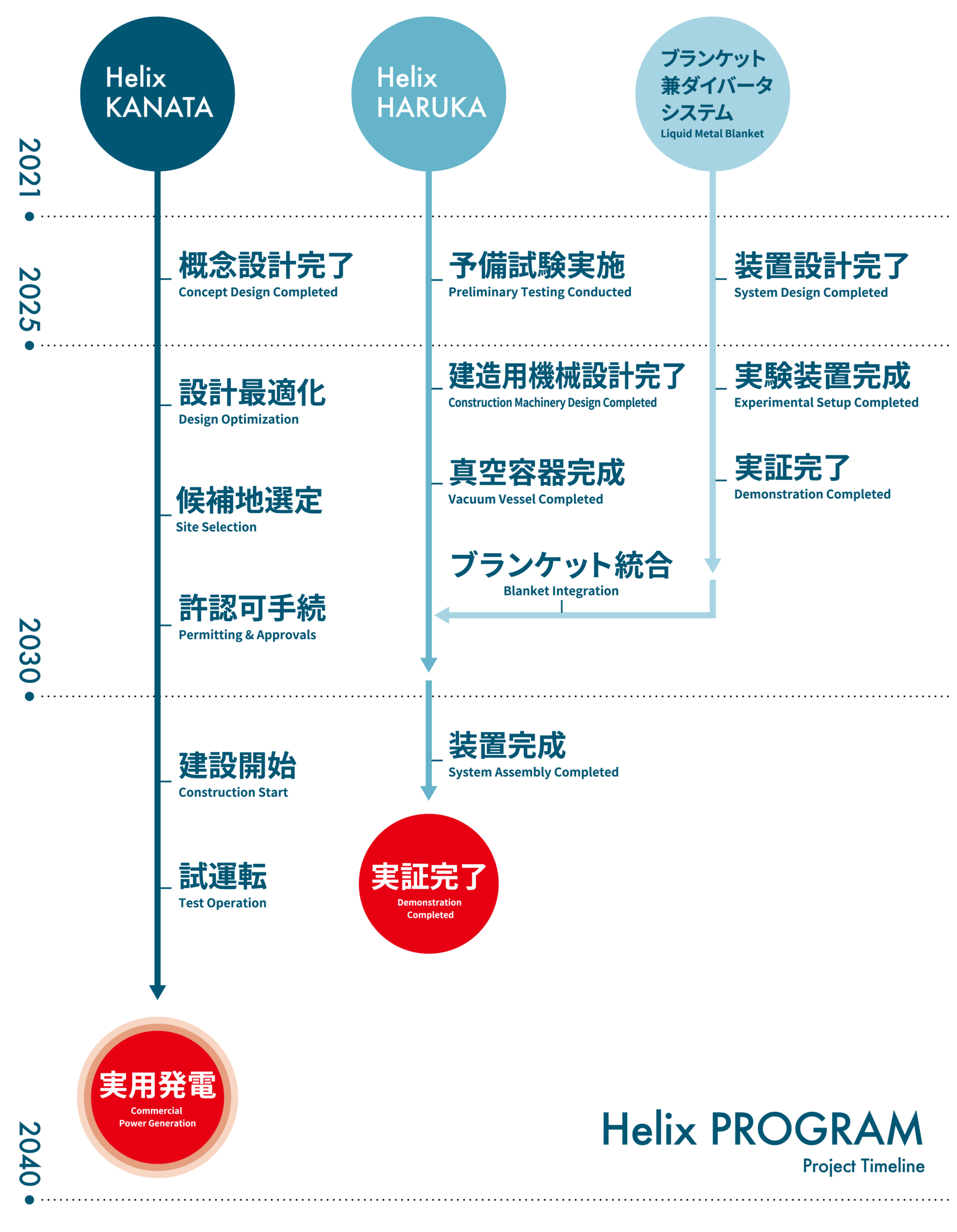 2021年に、大学共同利用機関法人 自然科学研究機構 核融合科学研究所における核融合に関する研究成果を活用して創業した、ヘリカル型核融合炉によるフュージョンエネルギーの実用化を目指す企業です。日本独自の核融合炉形式である「ヘリカル方式」は、これまでの国立大学や公的研究機関における約70年にわたる研究開発の結果、商用発電所に最も適した性質を備えた方式であることが示されています。その知見を生かして実用化を進める世界で唯一の企業として、「ヘリックス計画(Helix Program)」を進めています。ヘリックス計画では、2020年代中をめどに二大開発要素「高温超伝導マグネット」「ブランケット兼ダイバータ」の個別実証を完了し、2030年代中には、最終実証装置「Helix HARUKA」による統合実証、および発電初号機「Helix KANATA」による世界初の実用発電を達成する計画です。