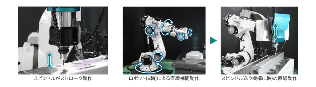 送り機構にはリニアガイドとボールねじを採用し、加工の一連動作を全て担います。ロボットは姿勢を決めて位置決めを行うだけとなり、ロボットの剛性や軌跡精度に依存しない高精度加工を実現します。
