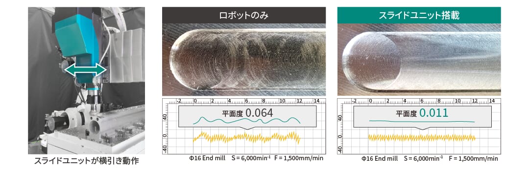 ロボットよりも高い動剛性と真直度を持つスライドユニットを搭載。 ロボットは加工位置で止まったまま、スライドユニットがフライス・エンドミル加工の動きを担い、ロボット単体では達成困難な高い平面度を実現します。
