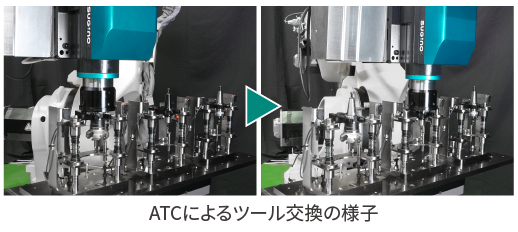 ロボットマシニングに必須なATC機能を標準搭載。1台で様々な加工に対応できます。 システムをコンパクトに設計できるため、ユニットチェンジに比べて大幅なコストダウンが見込めます。