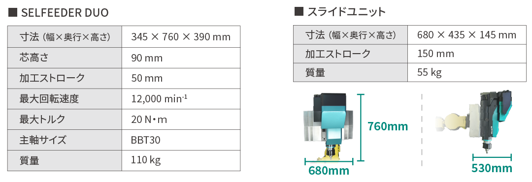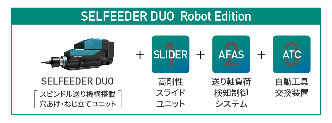 ドリリング・タッピングユニットのベストセラー「SELFEEDER(セルフィーダ」のロボット切削仕様です。 主軸と送り軸の両方にサーボモータを使用した汎用モデル「SELFEEDER DUO」に、高精度なロボット切削に必要不可欠な3つの仕様を搭載しています。