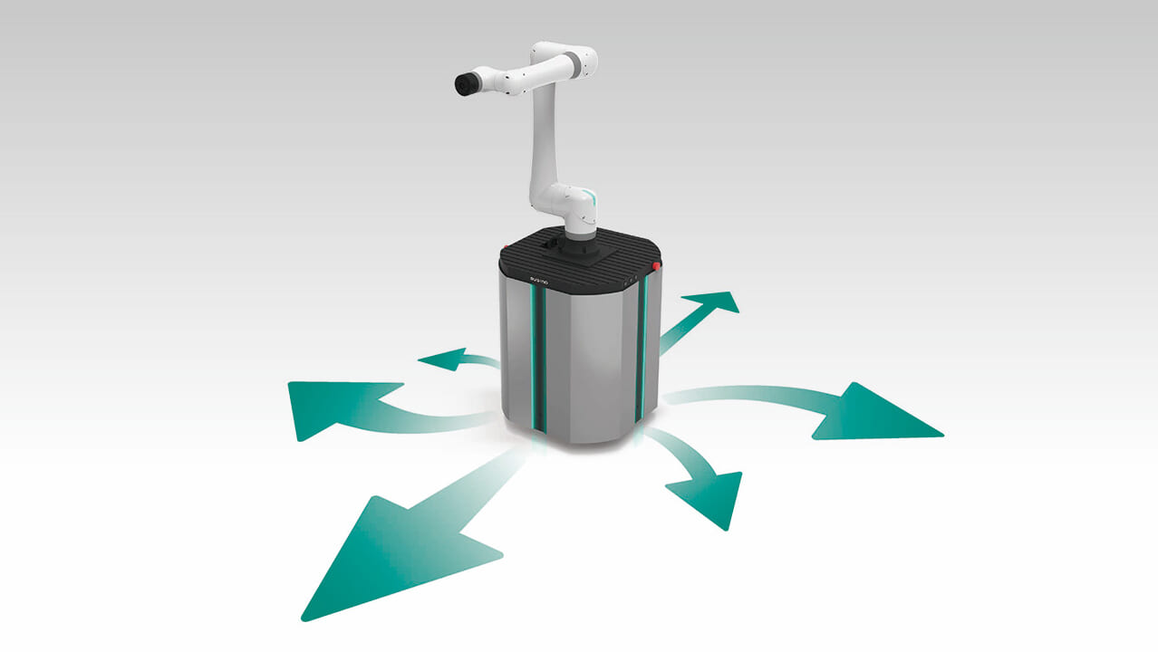 球駆動式で、その場旋回(スピンターン)や蛇行走行などが可能な全方向自在移動可能なロボットアーム搭載AMR(自律走行搬送ロボット)です。コンパクト設計で、狭いスペースでの運用が可能です。