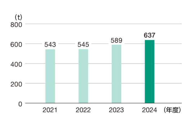 当社は、循環型社会の実現に貢献するため、廃棄物のリサイクル率向上、廃棄物削減の取り組みを実施しています。リサイクル率を高めるためには、廃棄物の分別を徹底することが重要です。分別表がごみ箱の傍に表示してあるか、実際に分別されているかについて、パトロールを毎月実施し、分別の徹底に努めています。また、事業所から出る廃棄物は、材質ごとに分けて有価物としてリサイクルしています。2024年度の有価物は739tでした。廃棄物排出量を削減するべく、取引先からの梱包材削減に取り組んでいます。品質は維持しつつ、不必要な梱包材を除いてもらうことで、廃棄するごみの量を減らすことが目的です。