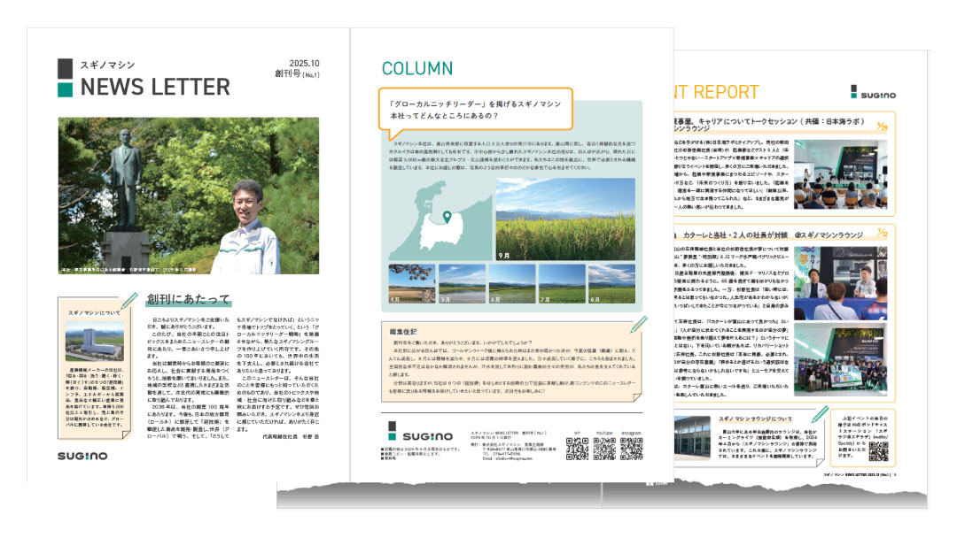 創刊にあたって(代表取締役社長・杉野岳あいさつ)/富山高専コラボ型授業/カンブリア宮殿放送/スギノマシンラウンジイベント