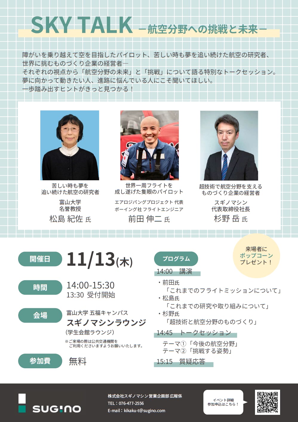普段の”夢教室”は富山県内の小学校を訪問していますが、今回は学生や教職員、社会人の方を対象にした”夢教室”を実施しました。第1部では「夢をつかむ思考法」をテーマに株式会社カターレ富山 代表取締役社長 左伴繫雄様と当社副社長(当時) 杉野岳の対談企画を、第2部では坪川潤之選手(現:SHIBUYA CITY FC)から「夢の実現について」をテーマにお話しいただきました。当日の様子はスギノマシンでのイベントを適宜紹介する当社提供のラジオ番組「スギラジ@スギラヂ」(KNBラジオ)で放送されました。放送内容はKNBポットキャストステーション (radiko/spotify)からお聞きいただけます。